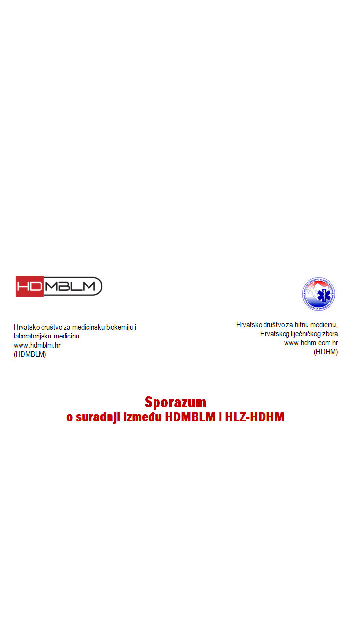 Dana 10. srpnja 2018. g. potpisan je Sporazum o suradnji između Hrvatskog društva za medicinsku biokemiju i laboratorijsku medicinu (HDMBLM) i Hrvatskog društva za hitnu medicinu Hrvatskog liječničkog zbora (HDHM). Svrha ovog dokumenta je međusobna suradnja i unaprijeđenje primjene dijagnostičkih postupaka u zbrinjavanju bolesnika u okviru bolničke i izvanbolničke hitne medicinske službe.
